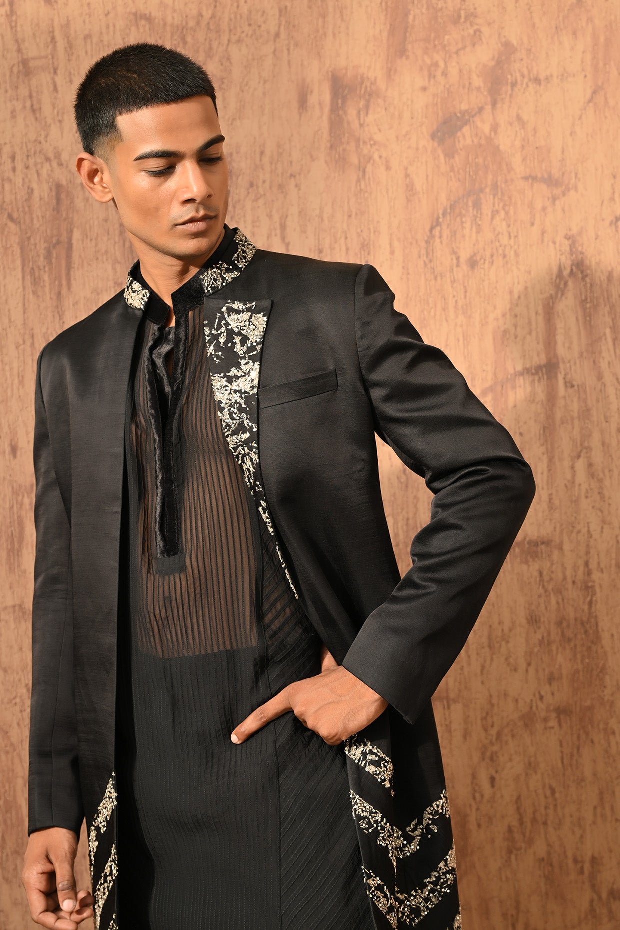 BLACK LINEN SATIN mens indowestern jacket kurta pant with zardozi