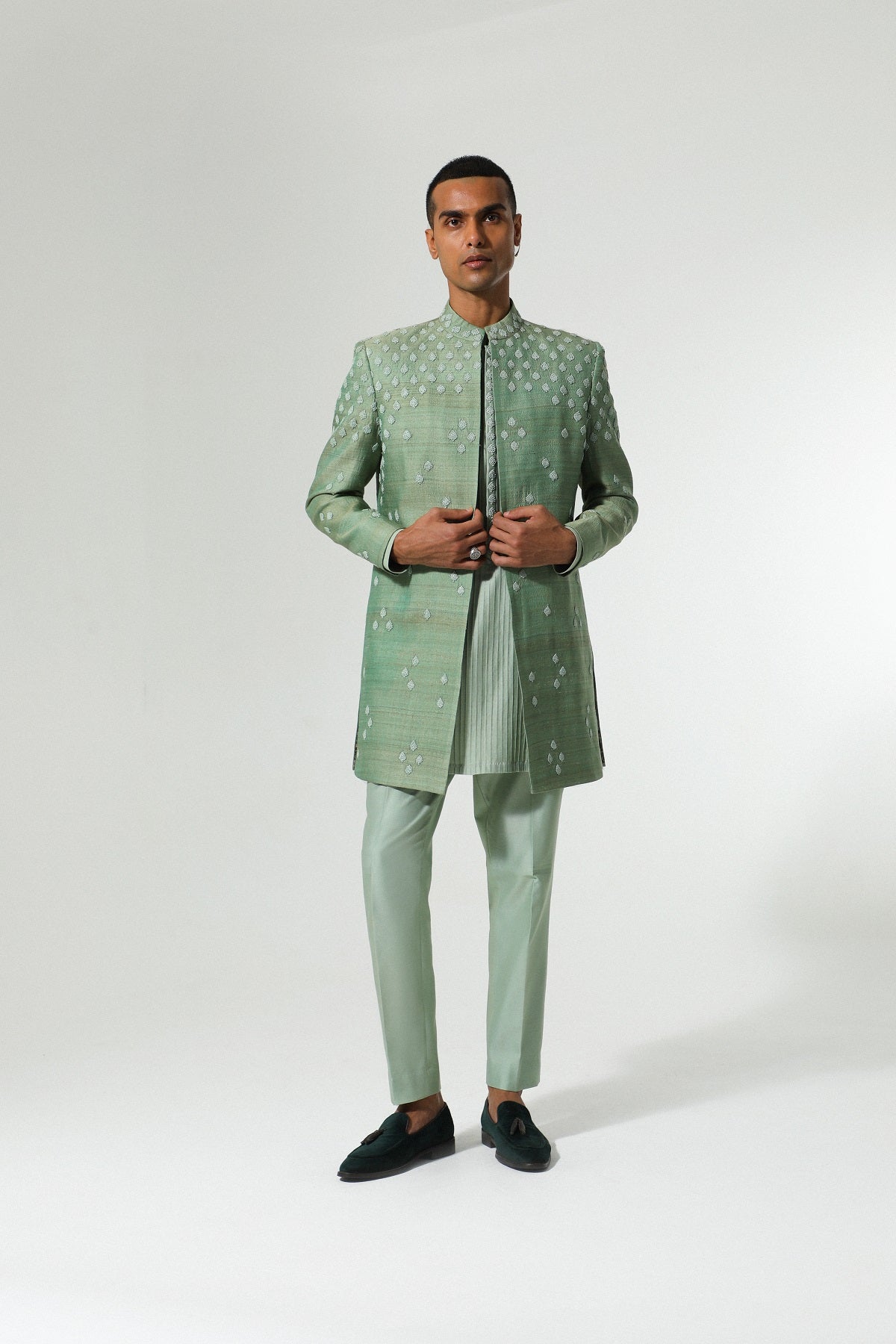 Indowestern bandh gala with an open front, crafted in luxurious silk and adorned with a chanderi kurta featuring pintucks and elegant French knots embroidery.