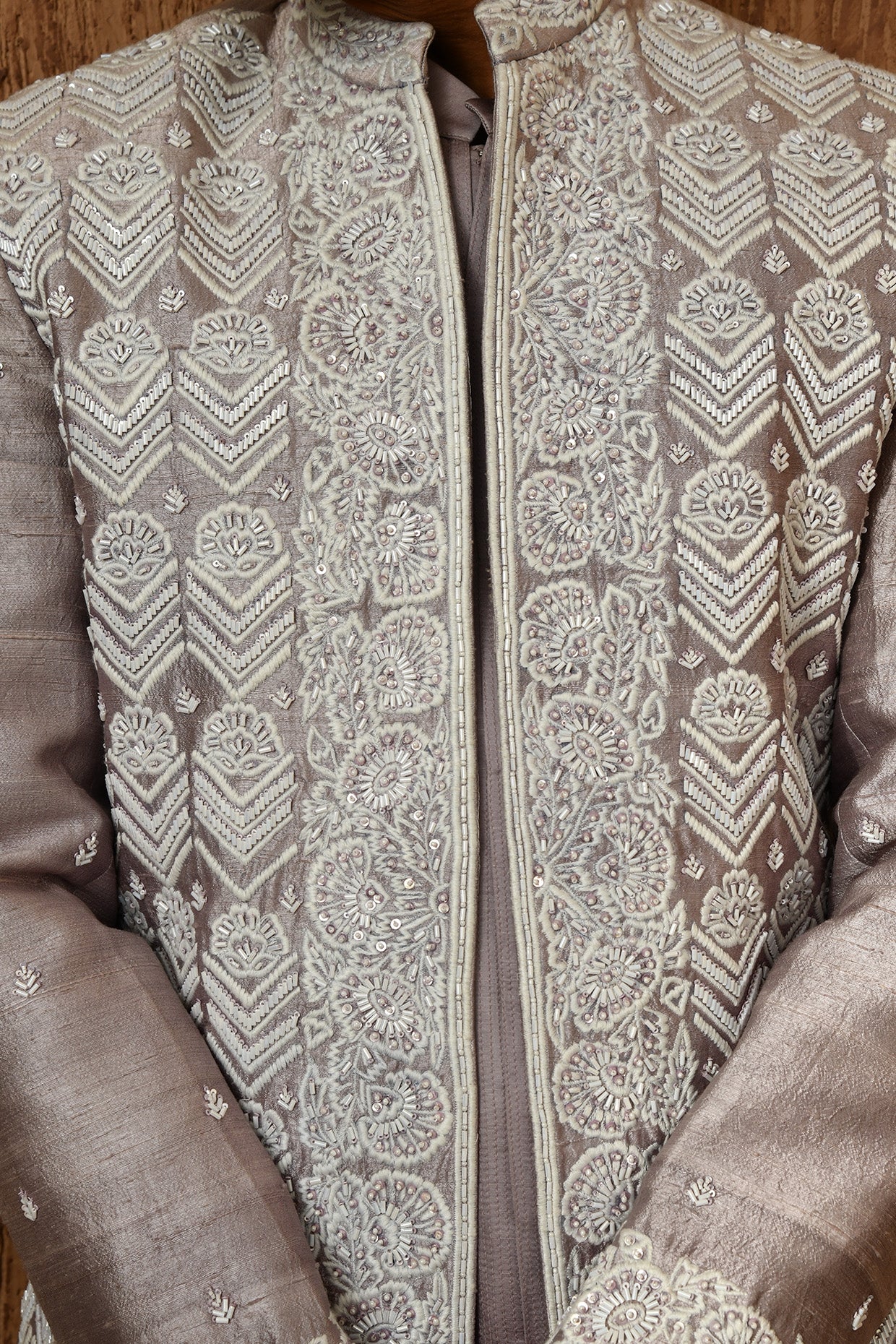 LAVENDER LINEN SATIN mens indowestern set with threadwork and zardozi