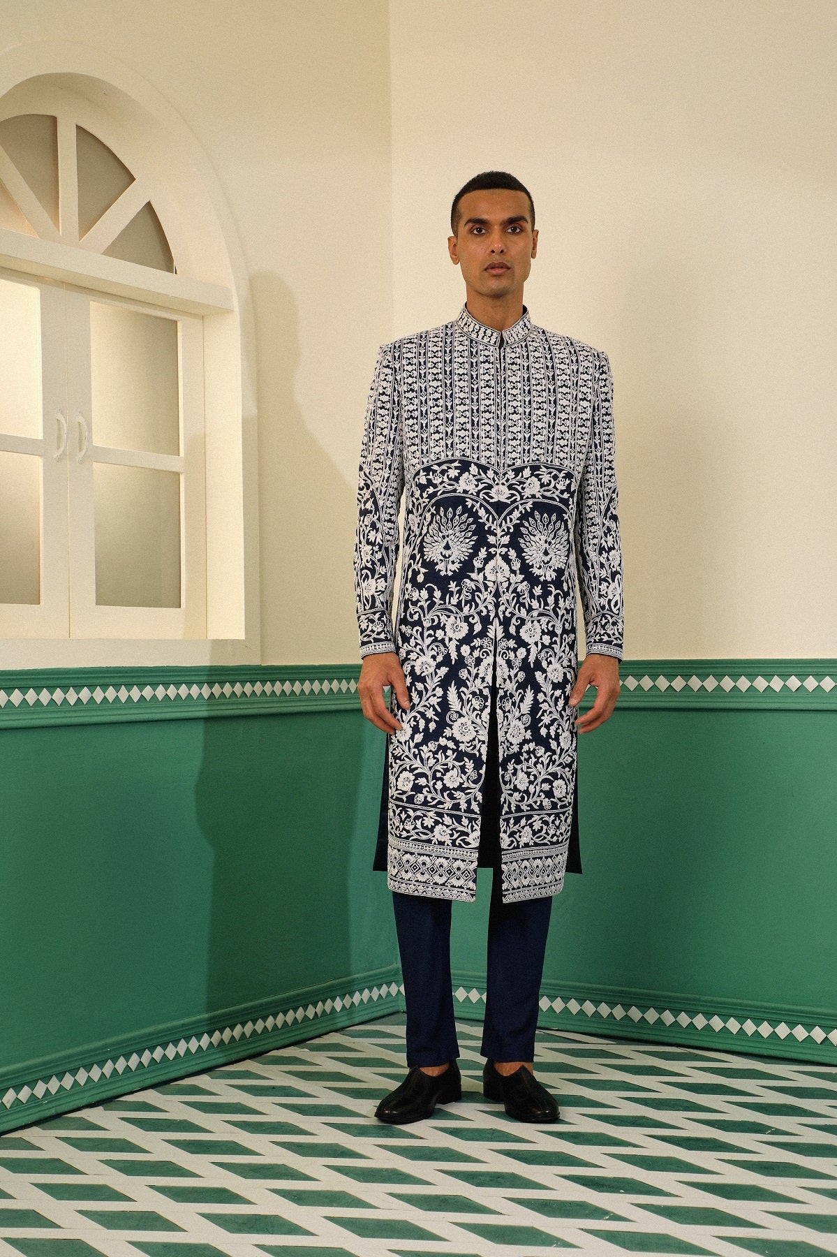 Navy blue dupion sherwani showcasing the elegance of dori and pearlwork SW1431